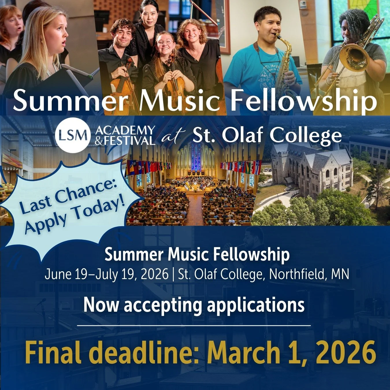 In addition to advanced musical instruction and numerous performance opportunities, LSM students form an intentional community, living together for four weeks on a Lutheran college campus. Since 1981, this unique and immersive program has guided the lives of thousands of young musicians, many of whom credit LSM as the starting place for their future careers and vocations.