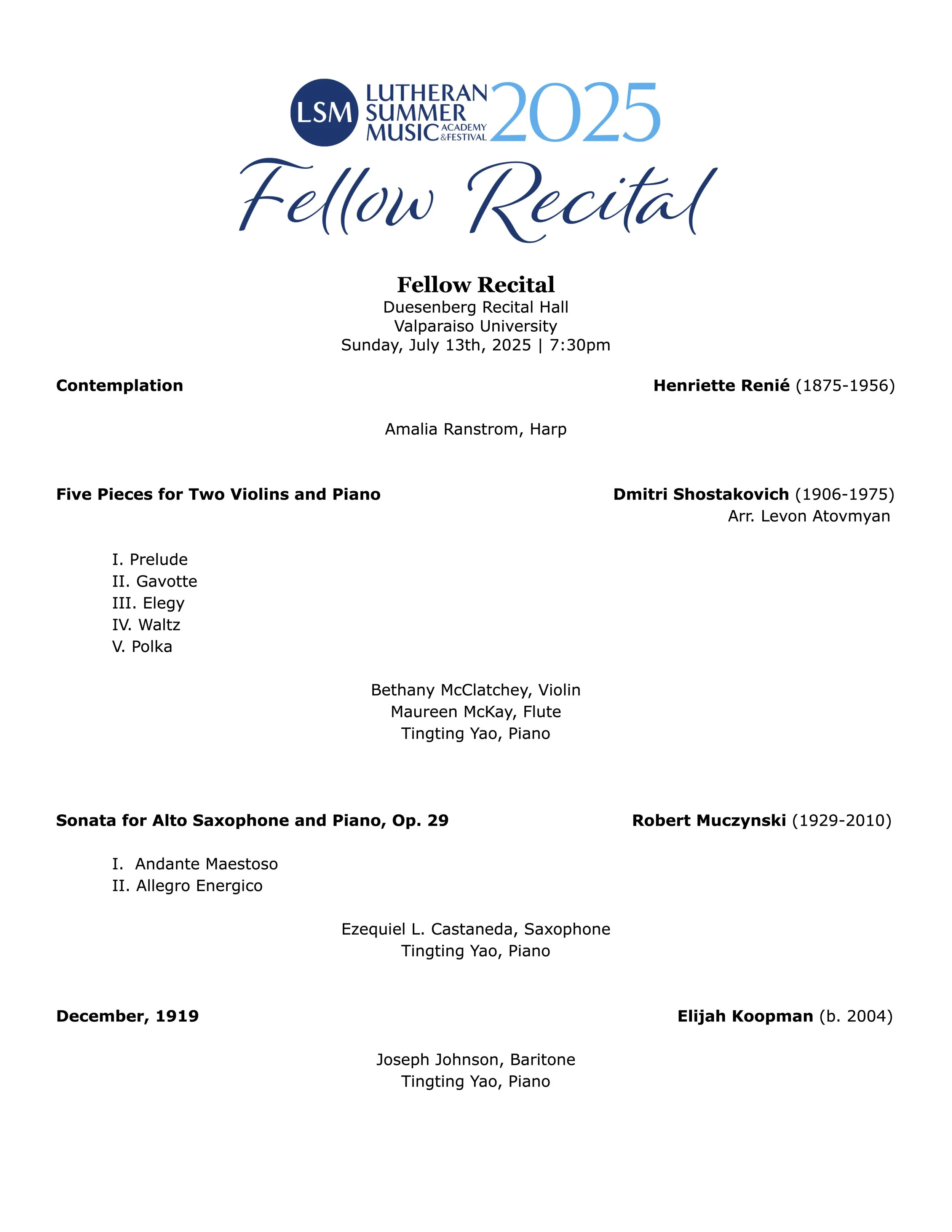 Fellow Recital | July 13, 2025 Jul 13 Written By LSM Admin Fellow Recital | Sunday, July 13 | 7:30 PM CDT Live from Lutheran Summer Music 2025 at Valparaiso University Click to enlarge program in separate tab LSM Admin