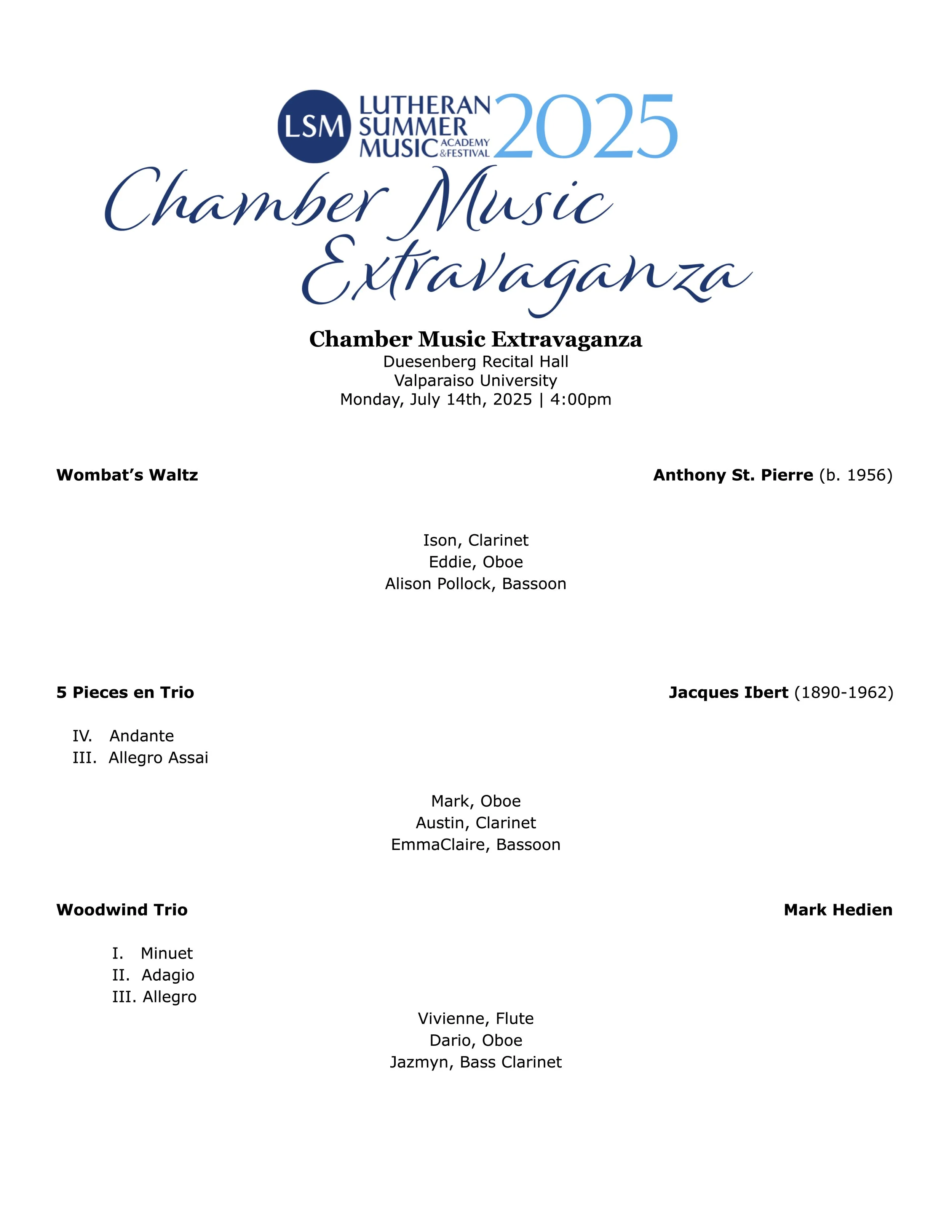 Chamber Music Extravaganza I | July 14, 2025 Jul 14 Written By LSM Admin Chamber Music Extravaganza I | Monday, July 14 | 4:00 PM CDT Live from Lutheran Summer Music 2025 at Valparaiso University Click to enlarge program in separate tab LSM Admin