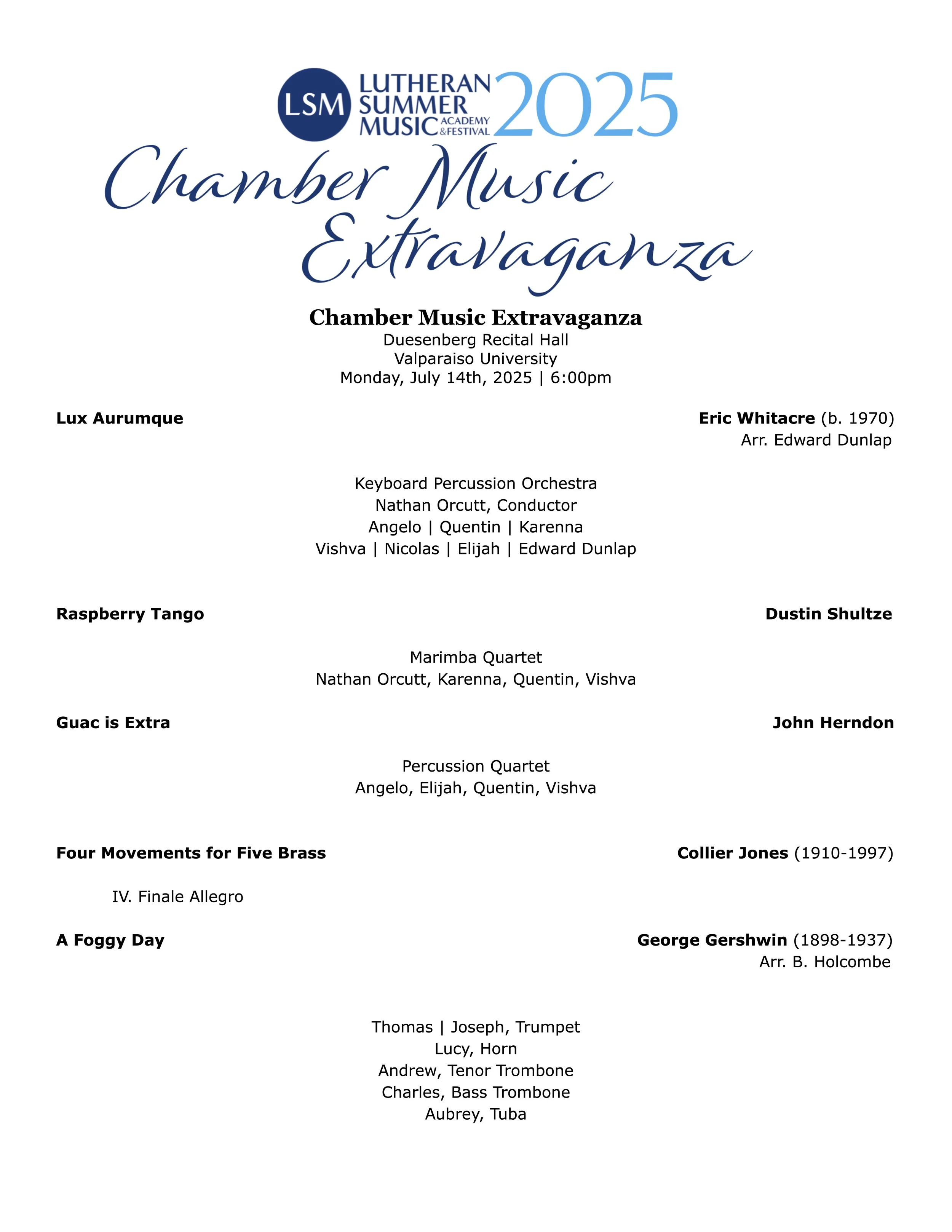 Chamber Music Extravaganza II | July 14, 2025 Jul 14 Written By LSM Admin Chamber Music Extravaganza II | Monday, July 14 | 6:00 PM CDT Live from Lutheran Summer Music 2025 at Valparaiso University Click to enlarge program in separate tab LSM Admin