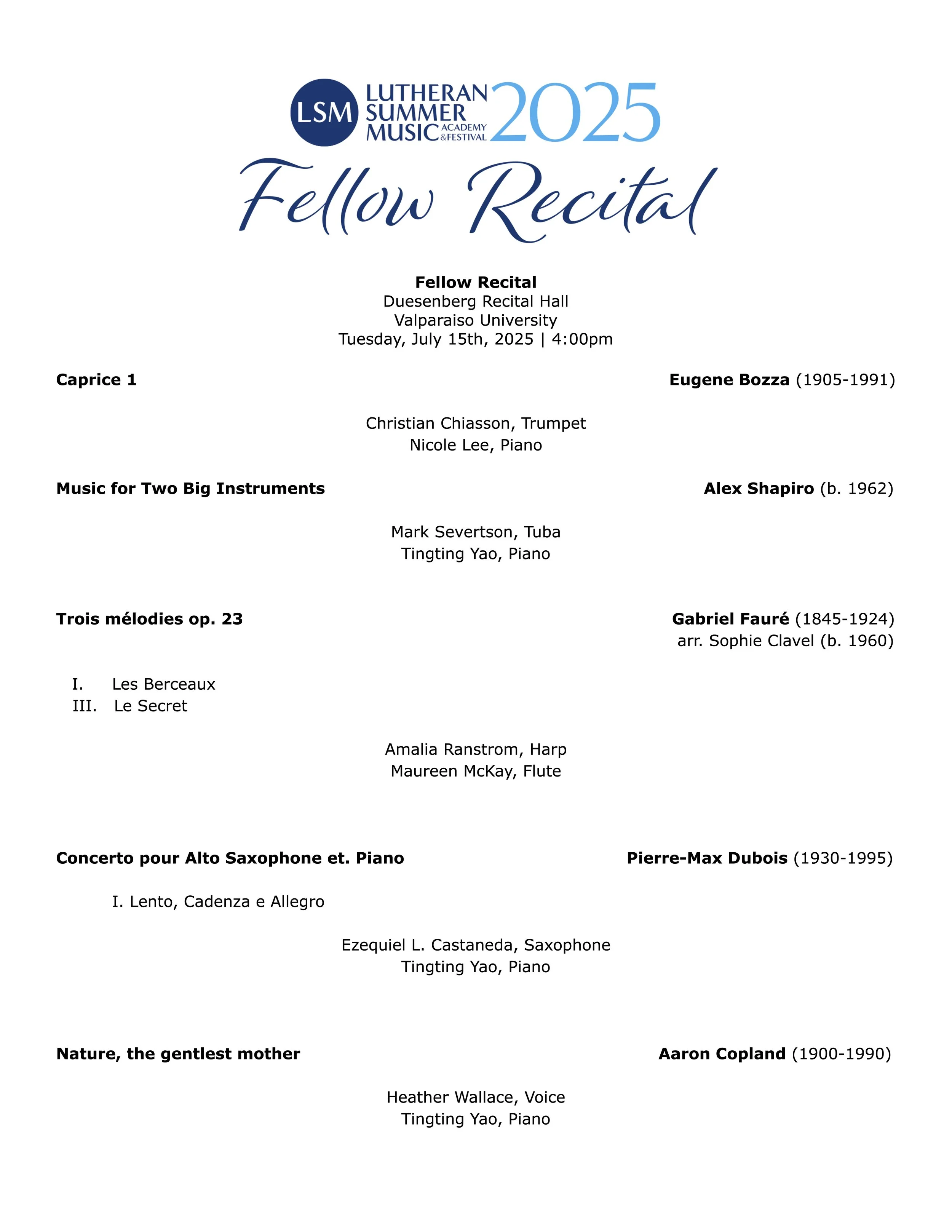 Fellow Recital | July 15, 2025 Jul 15 Written By LSM Admin Fellow Recital | Tuesday, July 15 | 4:00 PM CDT Live from Lutheran Summer Music 2025 at Valparaiso University Click to enlarge program in separate tab LSM Admin