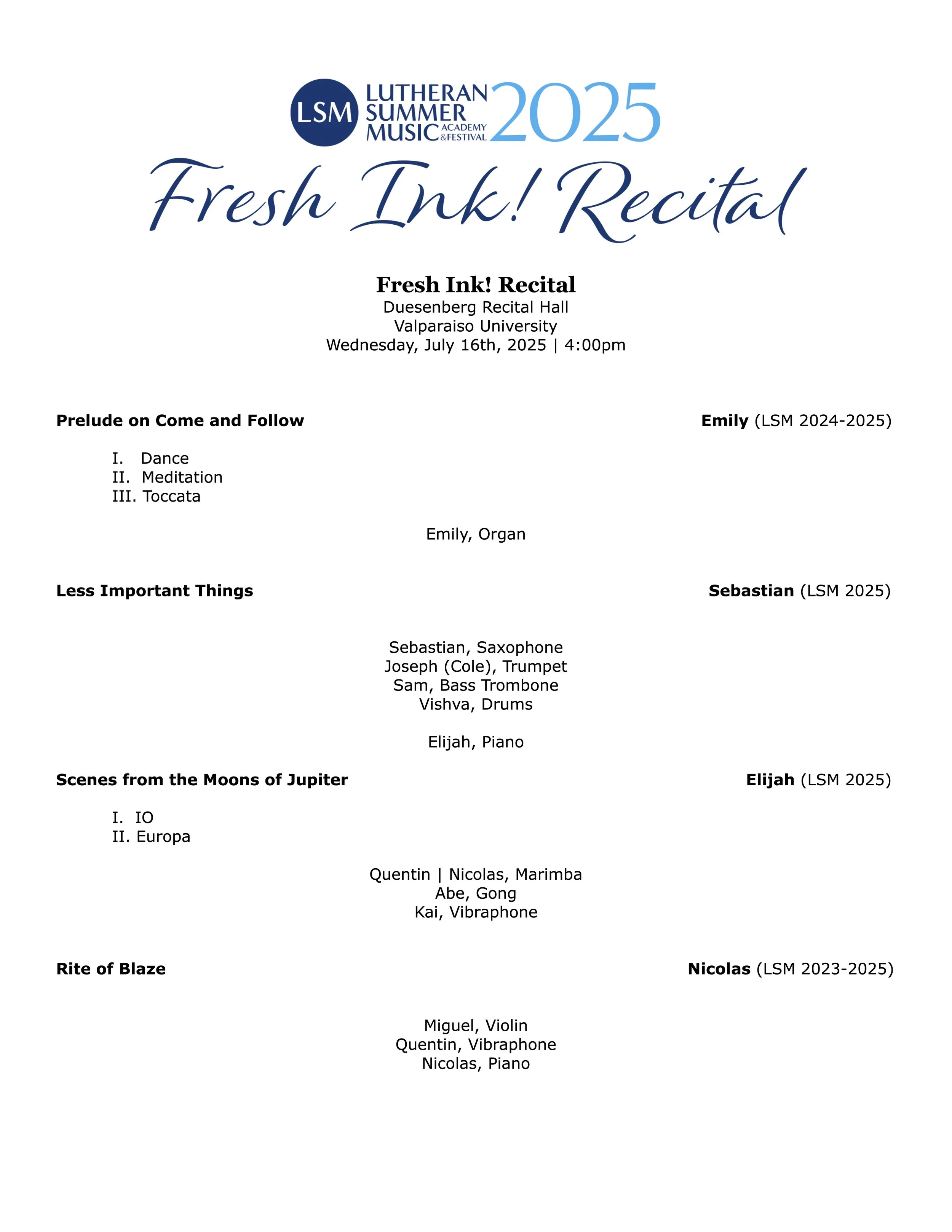 Fresh Ink! Composition Recital | July 16, 2025 Jul 16 Written By LSM Admin Fresh Ink! Composition Recital | Wednesday, July 16 | 4:00 PM CDT Live from Lutheran Summer Music 2025 at Valparaiso University Click to enlarge program in separate tab LSM Admin