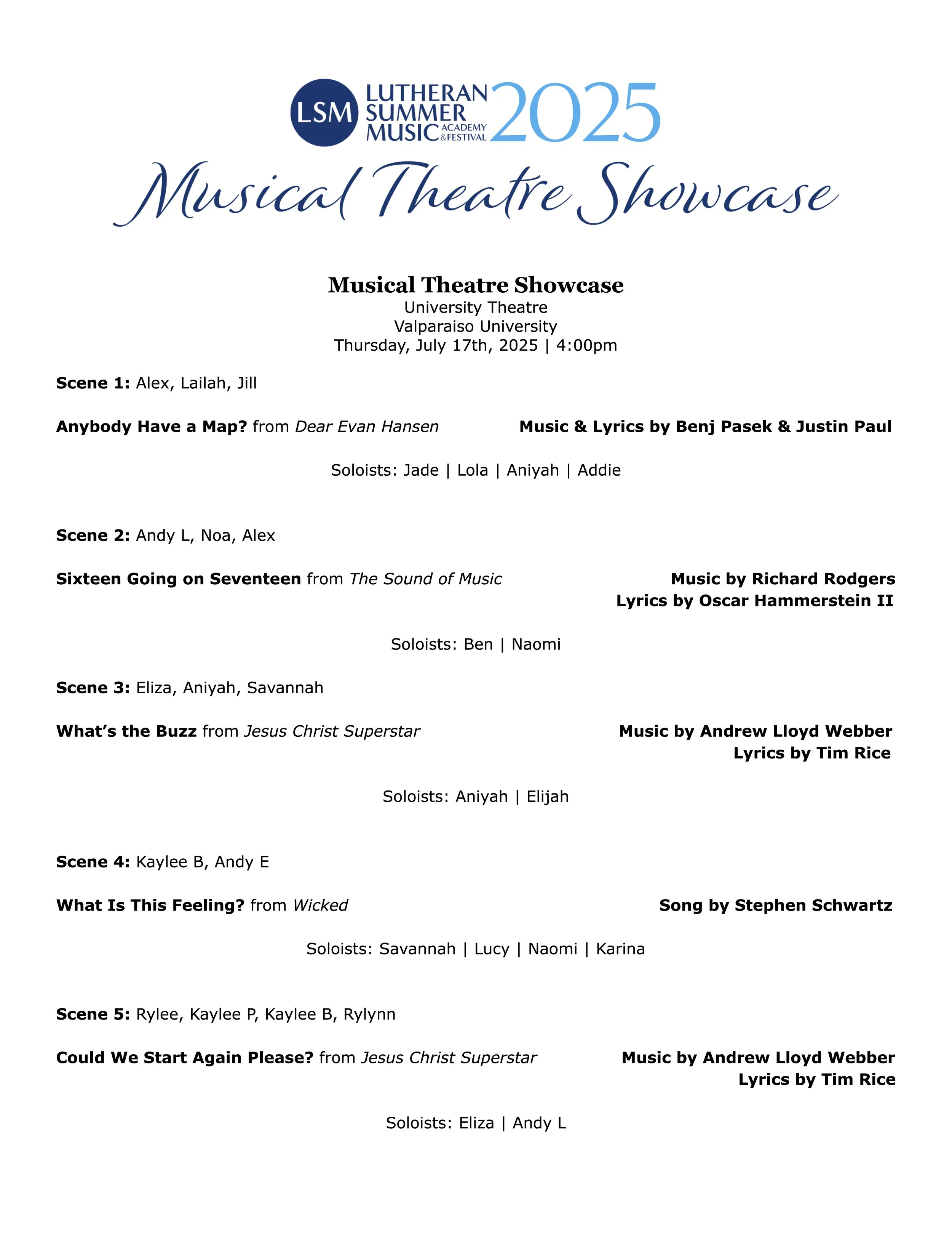 Musical Theatre Showcase | July 17, 2025 Jul 16 Written By LSM Admin Musical Theatre Showcase | Thursday, July 17 | 4:00 PM CDT Live from Lutheran Summer Music 2025 at Valparaiso University Click to enlarge program in separate tab LSM Admin