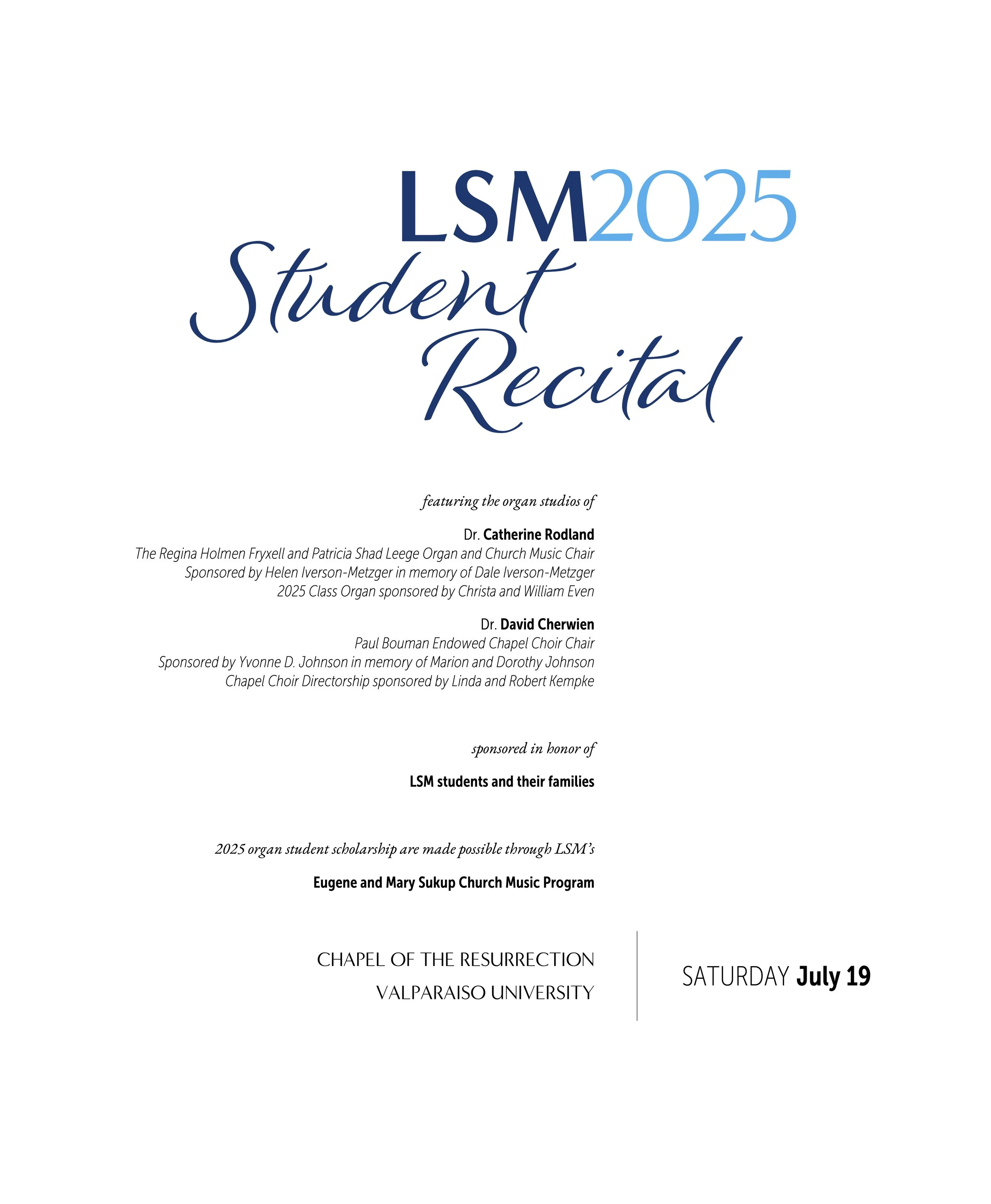 Student Organ Recital | July 19, 2025 Jul 18 Written By LSM Admin Student Organ Recital | Saturday, July 19 | 1:00 PM CDT Live from Lutheran Summer Music 2025 at Valparaiso University Click to enlarge program in separate tab LSM Admin