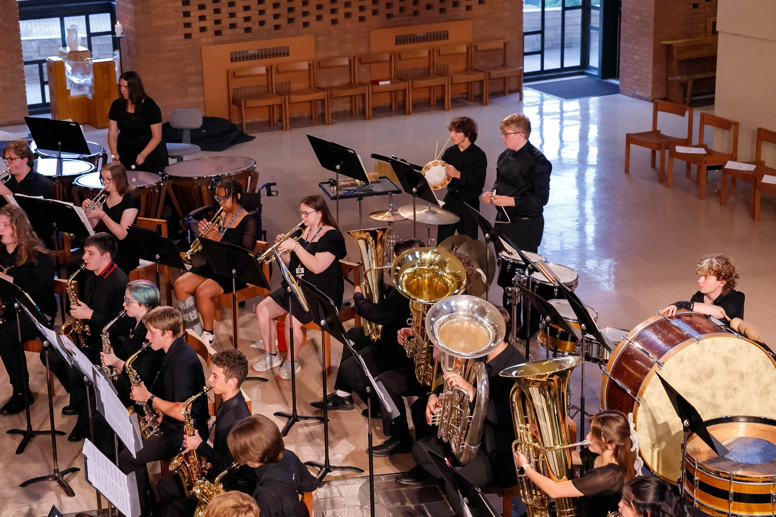 This audition-based ensemble usually has spots for two percussionists (drum kit and other instruments). Watch the Jazz Ensemble.